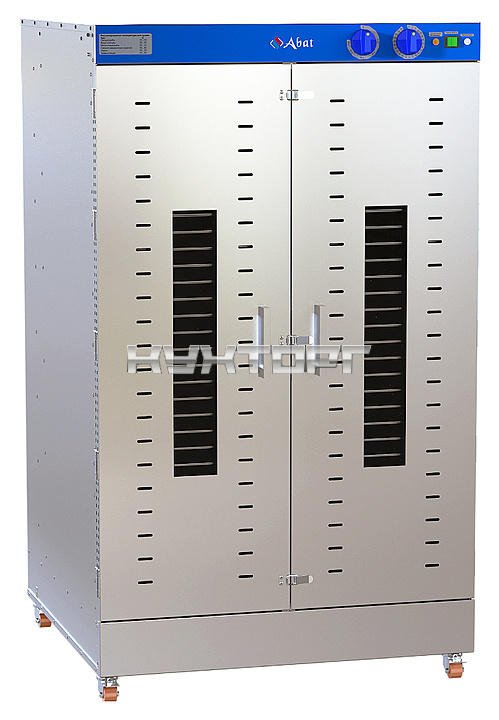 Дегидратор Abat ШС-32-2Г-02 предназначен для сушки трав, фруктов, овощей, ягод, макаронных изделий, мясных продуктов, приготовления пастилы и йогурта на предприятиях общественного питания и торговли. Модель оснащена 2 дверями, 8 вентиляторами, 4 направляющими для емкостей, ТЭН-ами различной мощности, аварийным термостатом, механическим таймером времени с функцией отключения и колесами с функцией стопорения. Каркас выполнен из нержавеющей стали.
