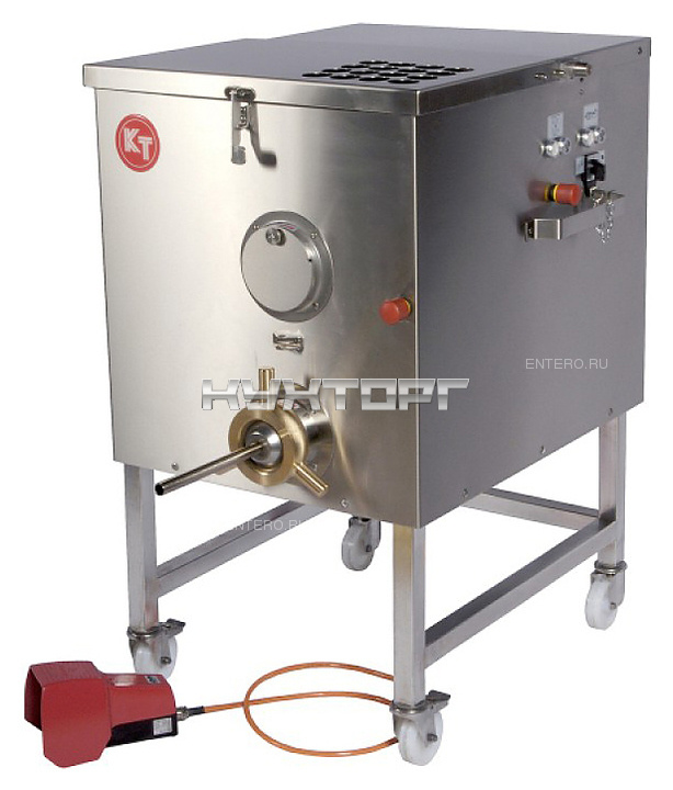 Мясорубка Koneteollisuus Oy (KT) LM-98/А предназначена для измельчения мяса и рыбы на фарш, повторного измельчения котлетной массы и набивки колбас на предприятиях пищевой промышленности и торговли. Модель оснащена 2 двигателями: для измельчения и для смешивания, равномерным ходом и ножной педалью сцепления с ключом безопасности для включения или остановки двигателя мясорубки. Корпус и шнек выполнены из нержавеющей стали.