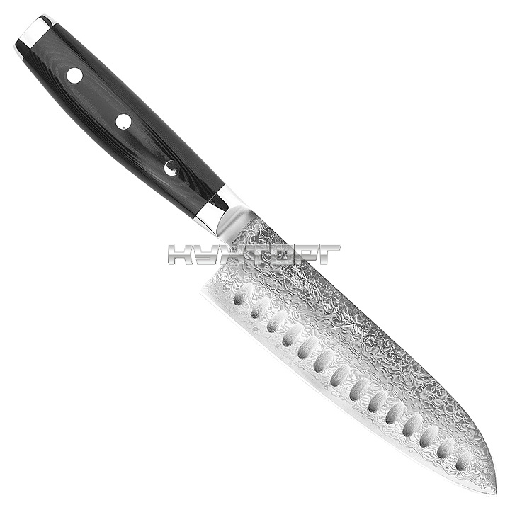 Кухонный нож YAXELL Santoku YA37001G серии GOU предназначен для нарезки продуктов на предприятиях общественного питания и торговли и для домашнего применения. Изделие оснащено лезвием с углублениями. Лезвие изготовлено из сверхпрочной порошковой стали SG2 Micro Carbide с обкладками из более мягкой дамасской стали по 50 слоев с каждой стороны, состоящей из хрома и небольшого количества углерода, рукоять - из черного полимерного материала Canvas Micarta на основе льняного полотна и смолы, заклепки рукояти и больстеры - из нержавеющей стали.