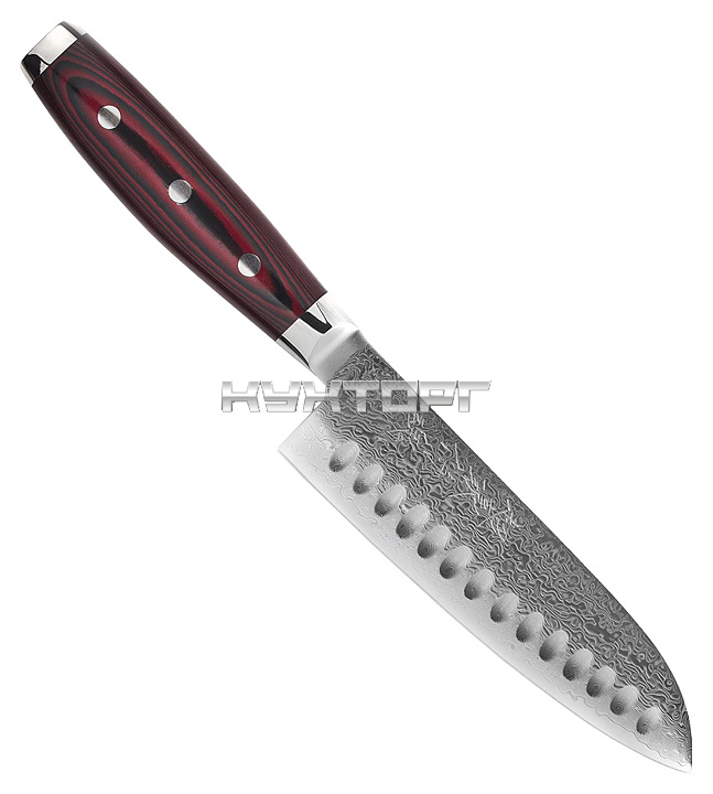 Кухонный нож YAXELL Santoku YA37101G серии SUPER GOU предназначен для нарезки продуктов на предприятиях общественного питания и торговли и для домашнего применения. Изделие оснащено лезвием с углублениями. Лезвие изготовлено из сверхпрочной порошковой стали SG2 Micro Carbide с обкладками из более мягкой дамасской стали по 80 слоев с каждой стороны, состоящей из хрома и небольшого количества углерода, рукоять - из красно-черного полимерного материала Canvas Micarta на основе льняного полотна и смолы, заклепки рукояти и больстеры - из нержавеющей стали.