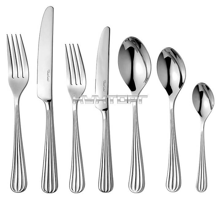 В комплект поставки входят 6 столовых ножей, 6 столовых вилок, 6 суповых ложек, 6 боковых ножей, 6 боковых вилок, 6 десертных ложек, 6 английских чайных ложек.