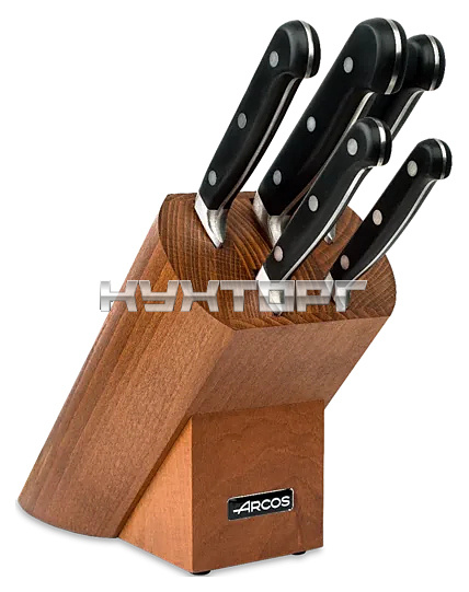 Набор кухонных ножей Arcos Opera 227000 5 шт. в деревянной подставке предназначен для использования на предприятиях общественного питания и торговли, а также в частных домах и квартирах. Лезвия ножей выполнены из эксклюзивной высококачественной нержавеющей стали NITRUM, эргономичные ручки - из полипропилена, подставка - из бука.