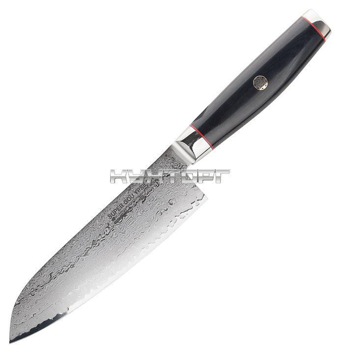 Кухонный нож YAXELL Santoku YA37201 серии SUPER GOU Ypsilon предназначен для нарезки продуктов на предприятиях общественного питания и торговли и для домашнего применения. Лезвие изготовлено из сверхпрочной порошковой стали SG2 Micro Carbide с обкладками из более мягкой дамасской стали по 96 слоев с каждой стороны, состоящей из хрома и небольшого количества углерода, рукоять - из черного полимерного материала Canvas Micarta на основе льняного полотна и смолы, заклепки рукояти и больстеры - из нержавеющей стали.