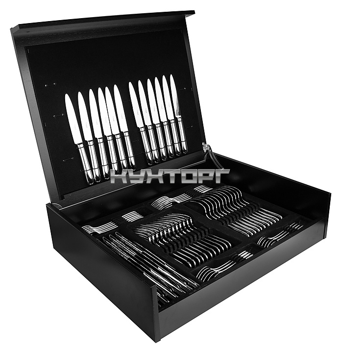 В комплект поставки входят 12 столовых ножей, 12 столовых вилок, 12 столовых ложек, 12 чайных ложек, 12 десертных ножей и 12 десертных вилок.