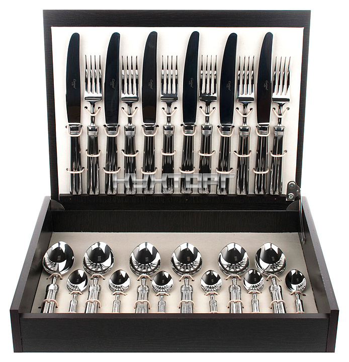 В комплект поставки входят 6 столовых ножей, 6 столовых вилок, 6 столовых ложек и 6 чайных ложек.