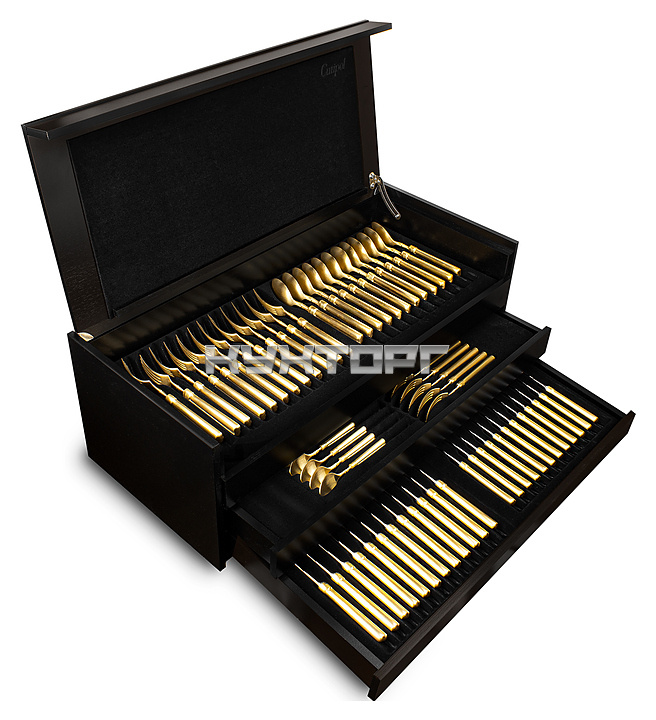 В комплект поставки входят 12 столовых ножей, 12 столовых вилок, 12 столовых ложек, 12 чайных ложек, 12 десертных ножей и 12 десертных вилок.