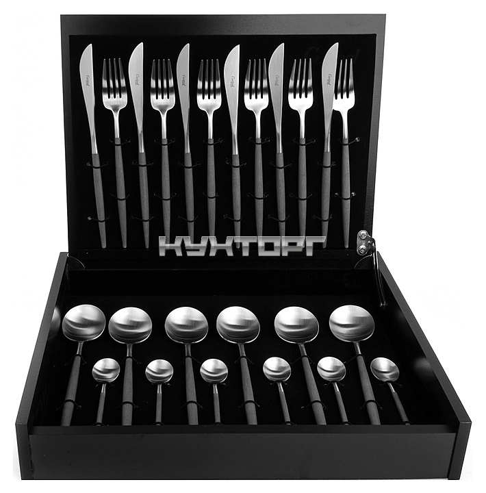 В комплект поставки входят 6 столовых ножей, 6 столовых вилок, 6 столовых ложек и 6 чайных ложек.