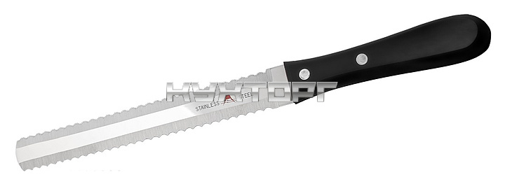 Кухонный нож Fuji Cutlery FG-3400 предназначен для разделки замороженных продуктов и костей в ресторанах и кафе. Модель оснащена волнообразной кромкой с тонкой серрейторной заточкой. Лезвие выполнено из высококачественной нержавеющей однослойной стали Mo-V, устойчивой к корозии, рукоятка - из термопластика.
