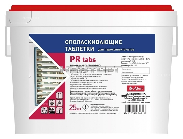 Ополаскивающие таблетки Abat PR tabs используется совместно с пароконвектоматами на предприятиях общественного питания и торговли для ополаскивания камеры. Средство не оставляет разводов, ускоряет высыхание и придает красивый ровный блеск.