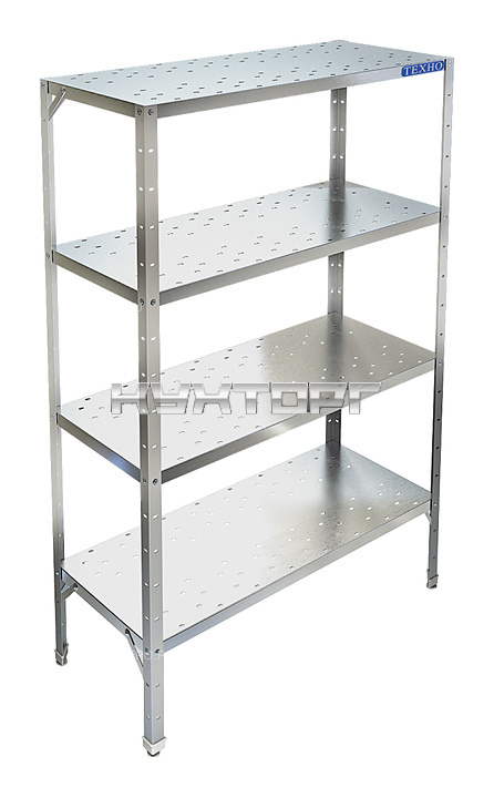 Кухонный стеллаж Техно-ТТ СТР-514/903 предназначен для хранения посуды, различного инвентаря и сухих продуктов на предприятиях общественного питания и торговли. Модель оснащена регулируемыми по высоте полками и ножками, что позволяет компенсировать неровности пола. Разборный каркас выполнен из уголка 40х40 мм толщиной 2 мм, покрытого порошковой краской серого цвета, перфорированные полки - из нержавеющей стали AISI 430 толщиной 0,8 мм.