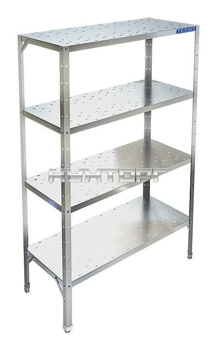Кухонный стеллаж Техно-ТТ СТР-414/800 предназначен для хранения посуды, различного инвентаря и сухих продуктов на предприятиях общественного питания и торговли. Модель оснащена регулируемыми по высоте полками и ножками, что позволяет компенсировать неровности пола. Разборный каркас выполнен из уголка 40х40 мм толщиной 2 мм, покрытого порошковой краской серого цвета, перфорированные полки - из нержавеющей стали AISI 304 толщиной 0,8 мм.
