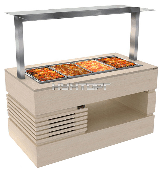 тепловой; островной, стационарный; мармит водяной; открытая полка; с подсветкой; 75 °C; 4 гастроемкости; GN 1/1 |