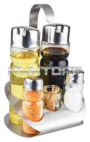 В комплект поставки входят солонка, перечница, бутылочка для масла, бутылочка для уксуса, баночка для зубочисток и подставка.