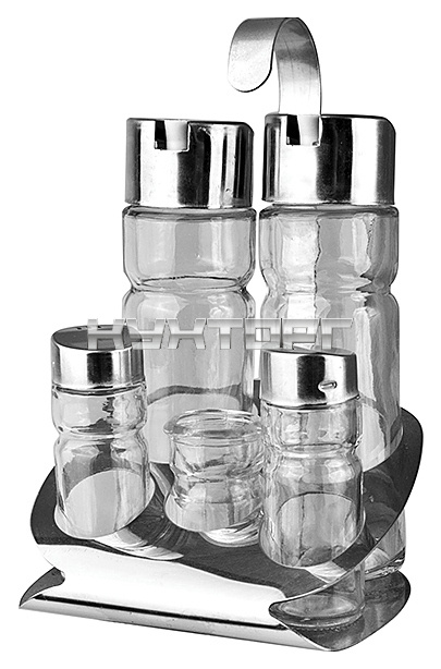 В набор входят солонка, перечница, емкости для уксуса и масла, стакан для зубочисток и подставка.