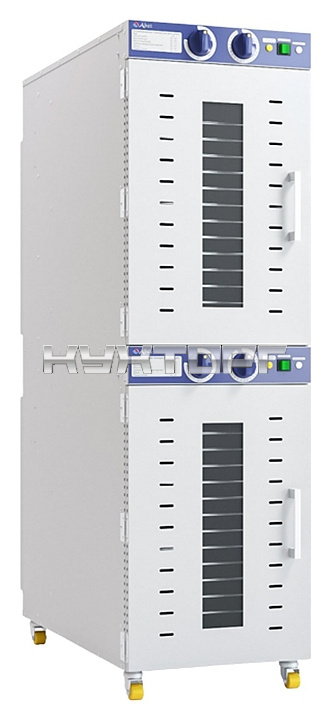 Дегидратор Abat ШС-32-2В-03 предназначен для сушки трав, фруктов, овощей, ягод, макаронных изделий, мясных продуктов, приготовления пастилы и йогурта на предприятиях общественного питания и торговли. Модель оснащена 2 независимыми камерами, каждая из которых с электромеханической панелью управления, механическим таймером времени и функцией отключения работы, ТЭН-ами различной мощности, 4 вентиляторами и колесами с функцией стопорения. Корпус выполнен из нержавеющей стали.