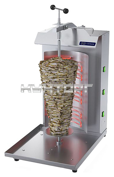 Электрический гриль KAYMAN ШЭ-Н-3-РП А используется на предприятиях общественного питания и торговли для приготовления мясной начинки популярного блюда шаурма (шаверма). Модель оснащена 3 изогнутыми ТЭНами, отражателями тепла и защитным козырьком, препятствующим обжиганию рук и перегреву электропривода. Корпус выполнен из нержавеющей стали, все элементы, контактирующие с пищей - из материалов, разрешенных для контакта из нержавеющей стали.