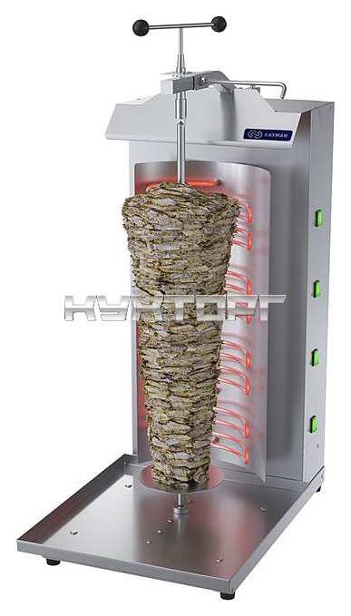 Электрический гриль KAYMAN ШЭ-ОЦ-4-РП А используется на предприятиях общественного питания и торговли для приготовления мясной начинки популярного блюда шаурма (шаверма). Модель оснащена 4 изогнутыми ТЭНами, отражателями тепла и защитным козырьком, препятствующим обжиганию рук и перегреву электропривода. Корпус выполнен из нержавеющей стали, все элементы, контактирующие с пищей - из материалов, разрешенных для контакта из оцинкованной стали.
