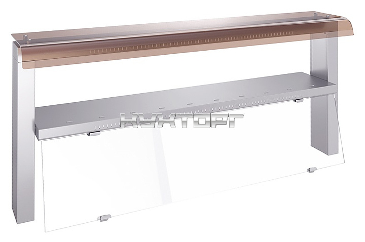 Полка ATESY Регата П-2-1840-02 устанавливается на столешницу модуля линии раздачи «Регата» и служит для выкладки тарелок с готовыми блюдами. Модель оснащена одним светильником, освещающим столешницу. Изделие выполнено из нержавеющей стали AISI430, верхняя изогнутая часть - из стекла.