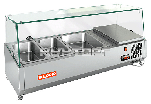 Настольная холодильная витрина HICOLD VRTG 1000 используется на предприятиях общественного питания и торговли для демонстрации, охлаждения и кратковременного хранения салатов, гарниров, закусок и других готовых блюд. Модель оснащена стеклянной надстройкой и специальным креплением для стола и предназначена для использования совместно с холодильным столом PZE3-11/GN. Изделие выполнено из нержавеющей стали.
