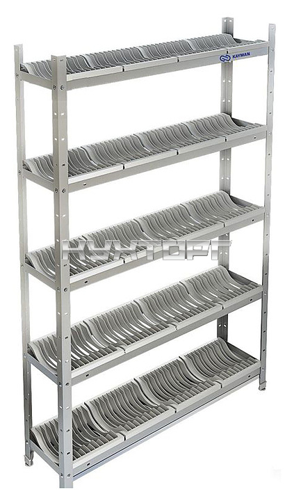 Cтеллаж KAYMAN СКТ-251/1203 используется на предприятиях общественного питания и торговли для сушки и хранения тарелок. Каркас выполнен из оцинкованного уголка, полки - из нержавеющей стали AISI 430, поддон - из нержавеющей стали AISI 308, кассеты - из пластмассы.