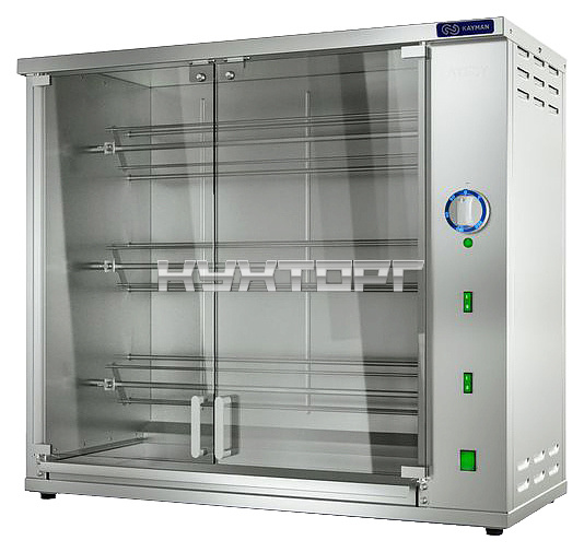 Гриль для кур KAYMAN ГЭ-3Ш A используется на предприятиях общественного питания и торговли для жарки тушек кур, цыплят, куриных окорочков, грудок и других продуктов питания. Модель оснащена 3 съемными шампурами и ТЭНами, расположенными на задней стенке камеры. Корпус выполнен из пищевой нержавеющей стали AISI 430, все внутренние элементы, соприкасающиеся с продуктами - из пищевой нержавеющей стали, двери - из термостойкого стекла.