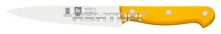 Кухонный нож ICEL Technik Utility knife 27300.8603000.150 оснащен эргономичной ручкой желтого цвета из полиоксиметилена, устойчивого к высоким температурам, и заточенным вручную лезвием, выполненным из высококачественной нержавеющей стали X50CrMoV15 с добавлением хрома, молибдена и ванадия. Твердость стали, закаленной по специальной технологии, составляет более 56 HRC. Ручка соединена с лезвием посредством заклепок из нержавеющей стали.