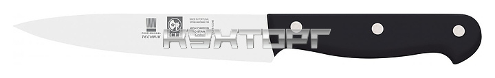 Кухонный нож ICEL Technik Utility knife 27100.8603000.150 оснащен эргономичной ручкой черного цвета из полиоксиметилена, устойчивого к высоким температурам, и заточенным вручную лезвием, выполненным из высококачественной нержавеющей стали X50CrMoV15 с добавлением хрома, молибдена и ванадия. Твердость стали, закаленной по специальной технологии, составляет более 56 HRC. Ручка соединена с лезвием посредством заклепок из нержавеющей стали.