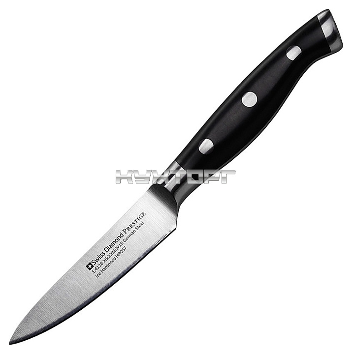 Кухонный нож Swiss Diamond SDPK06 предназначен для нарезки овощей на предприятиях общественного питания и торговли, а также в домашних условиях. Модель оснащена острым лезвием и рукояткой с удобным захватом. Лезвие выполнено из молибден-ванадиевой стали 1.4116 (X50 Cr Mo V 15) с технологией низкотемпературной закалки, рукоятка – из ацетальной смолы (полиоксиметилен), больстер – из нержавеющей стали.