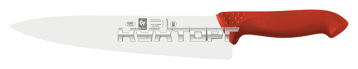 Поварской нож ICEL Horeca Prime Chef's knife 28400.HR27000.250 оснащен эргономичной ручкой красного цвета из приятного на ощупь пластика Proflex, устойчивого к высоким температурам и воздействию агрессивных элементов, и заточенным вручную лезвием, выполненным из высококачественной нержавеющей стали X50CrMoV15 с добавлением хрома, молибдена и ванадия. Твердость стали, закаленной по специальной технологии, составляет более 56 HRC. Ручка, изготовленная по системе инжекции, имеет специальную антибактериальную защиту Microban.