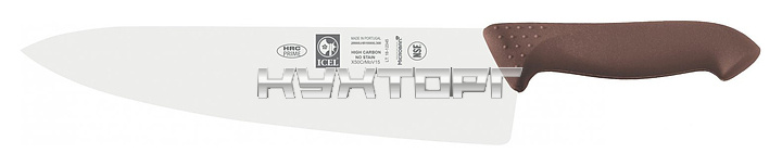 Поварской нож ICEL Horeca Prime Chef's Knife 28900.HR10000.300 оснащен эргономичной ручкой коричневого цвета из приятного на ощупь пластика Proflex, устойчивого к высоким температурам и воздействию агрессивных элементов, и заточенным вручную лезвием, выполненным из высококачественной нержавеющей стали X50CrMoV15 с добавлением хрома, молибдена и ванадия. Твердость стали, закаленной по специальной технологии, составляет более 56 HRC. Ручка, изготовленная по системе инжекции, имеет специальную антибактериальную защиту Microban.