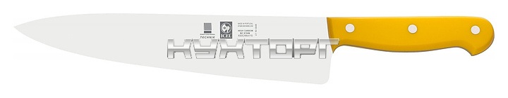 Поварской нож ICEL Technik Chef's knife 27300.8610000.300 оснащен эргономичной ручкой желтого цвета из полиоксиметилена, устойчивого к высоким температурам, и заточенным вручную лезвием, выполненным из высококачественной нержавеющей стали X50CrMoV15 с добавлением хрома, молибдена и ванадия. Твердость стали, закаленной по специальной технологии, составляет более 56 HRC. Ручка соединена с лезвием посредством заклепок из нержавеющей стали.