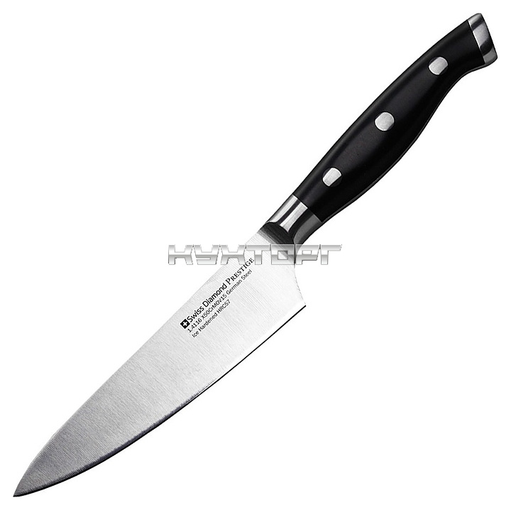 Универсальный кухонный нож Swiss Diamond SDPK05 предназначен для нарезки различных продуктов на предприятиях общественного питания и торговли, а также в домашних условиях. Модель оснащена широким острым лезвием и рукояткой с удобным захватом. Лезвие выполнено из молибден-ванадиевой стали 1.4116 (X50 Cr Mo V 15) с технологией низкотемпературной закалки, рукоятка – из ацетальной смолы (полиоксиметилен), больстер – из нержавеющей стали.