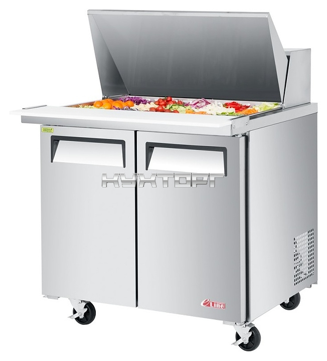 Холодильный стол Turbo air EST-36-15 серии E line используется на предприятиях общественного питания и торговли для кратковременного хранения предварительно охлажденных пищевых продуктов и приготовления из них сэндвичей. Модель оснащена встоенным холодильным агрегатом, холодильной камерой с распашными дверьми и столешницей с боковыми фиксаторами для разделочной доски. Вертикально ориентированный корпус за исключением задней стенки, фронтальная облицовка двери, столешница и крышка выполнены из высококачественной нержавеющей стали SUS439 производства Posco, полка – из стального прутка с виниловым покрытием, разделочная доска – из термостойкого полиэтилена, термоизоляция – из пенополиуретана высокой плотности, испаритель с антикоррозийным покрытием.