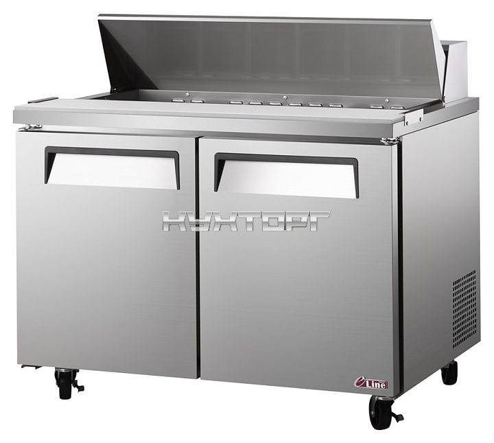 Холодильный стол Turbo air EST-60 серии E line используется на предприятиях общественного питания и торговли для кратковременного хранения предварительно охлажденных пищевых продуктов и приготовления из них сэндвичей. Модель оснащена встоенным холодильным агрегатом, холодильной камерой с распашными дверьми и столешницей с боковыми фиксаторами для разделочной доски. Вертикально ориентированный корпус за исключением задней стенки, фронтальная облицовка дверей, столешница и крышка выполнены из высококачественной нержавеющей стали SUS439 производства Posco, полка – из стального прутка с виниловым покрытием, разделочная доска – из термостойкого полиэтилена, термоизоляция – из пенополиуретана высокой плотности, испаритель с антикоррозийным покрытием.
