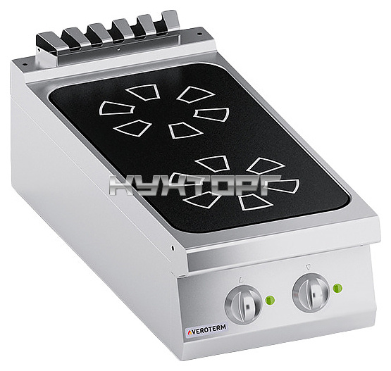 Настольная индукционная плита VEROTERM VT4CIEP05TT используется на предприятиях общественного питания и торговли для приготовления широкого ассортимента блюд в наплитной посуде. Принцип работы основан на непосредственном нагреве металлической посуды создаваемыми высокочастотным магнитным полем индуцированными вихревыми токами. Модель оснащена 2 варочными зонами, фронтальной электромеханической панелью управления и дисплеями индикации на рабочей поверхности. Корпус выполнен из нержавеющей стали AISI 430, рабочая поверхность – из высококачественной стеклокерамики черного цвета (Швейцария).