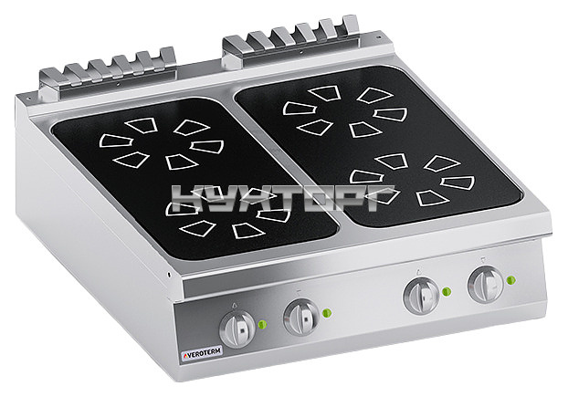 Настольная индукционная плита VEROTERM VT4CIEP10TT используется на предприятиях общественного питания и торговли для приготовления широкого ассортимента блюд в наплитной посуде. Принцип работы основан на непосредственном нагреве металлической посуды создаваемыми высокочастотным магнитным полем индуцированными вихревыми токами. Модель оснащена 4 варочными зонами, фронтальной электромеханической панелью управления и дисплеями индикации на рабочей поверхности. Корпус выполнен из нержавеющей стали AISI 430, рабочая поверхность – из высококачественной стеклокерамики черного цвета (Швейцария).