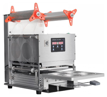 Полуавтоматический запайщик лотков Hualian HL-95A используется на производственных площадках, предприятиях пищевой промышленности, общественного питания и торговли для запечатывания термосвариваемой пленкой цилиндрических лотков и контейнеров с готовыми блюдами, полуфабрикатами, фруктами и другой пищевой продукцией. Модель оснащена выдвижной несъемной рабочей матрицей, 2 рулонодержателями с ограничителями рулона, панелью управления с мембранной клавиатурой и 4 светодиодными цифровыми дисплеями. Корпус выполнен из нержавеющей стали.