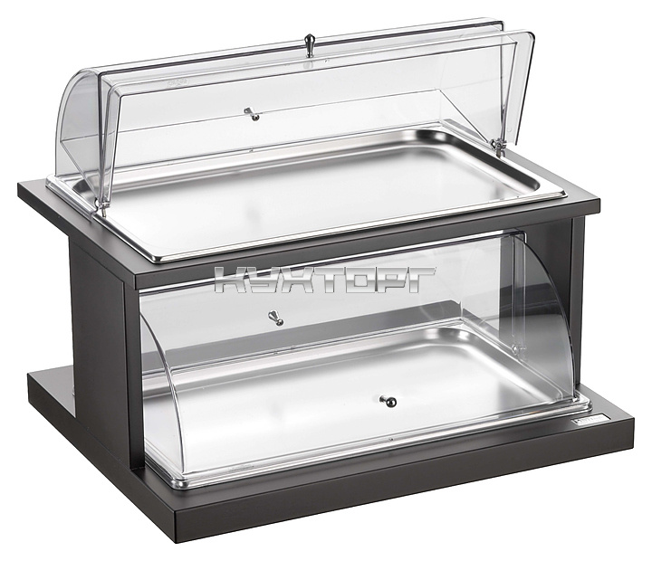 Сервировочный поднос Pintinox 50952552 используется на предприятиях общественного питания и торговли, в барах, ресторанах и кафе для выкладки фруктов, овощей, хлебобулочных и кондитерских изделий. Модель оснащена 2 откатными крышками, что предотвращает заветривание продуктов и попадание на них пыли и грязи. Основание выполнено из древесины.