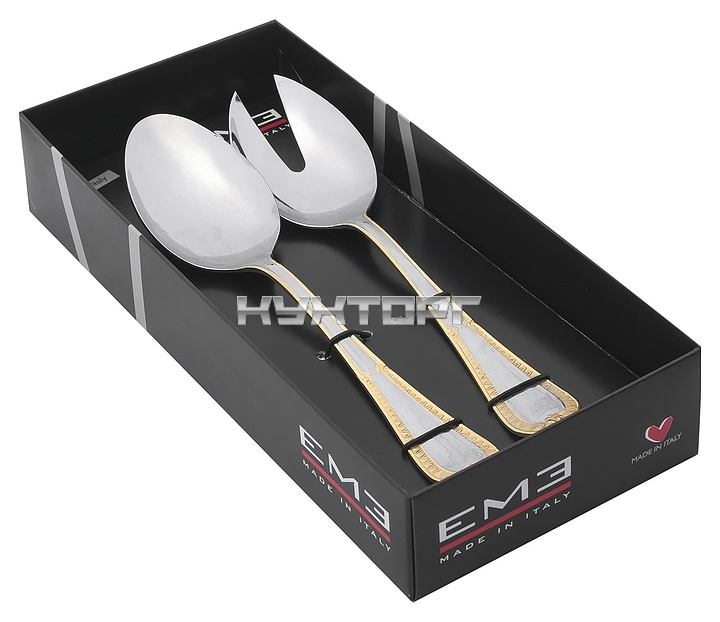 Набор для салата EME Firenze Gold Decor C03FI/OR из коллекции Firenze Oro используется на предприятиях общественного питания и в домашних условиях для сервировки стола во время торжеств. Приборы изготовлены из нержавеющей стали 18/10 с глянцевой поверхностью и позолоченной окантовкой, нанесенной вручную.