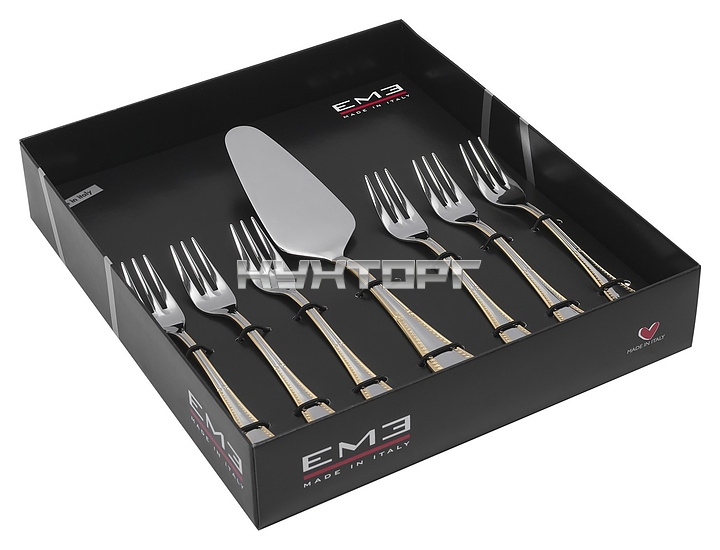 В комплект поставки входят 6 десертных вилок и лопатка для сервировки.