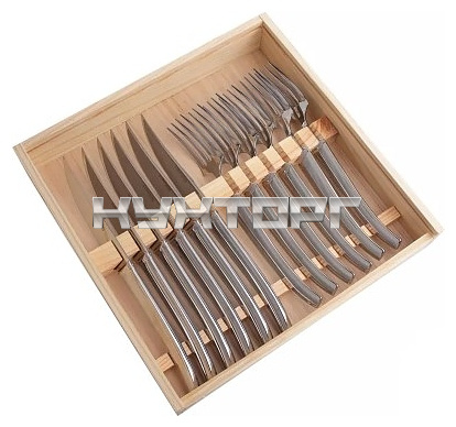 В комплект поставки входят 6 ножей и 6 вилок для стейка в деревянной коробке.