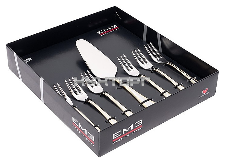 В комплект поставки входят 6 десертных вилок и лопатка для сервировки.