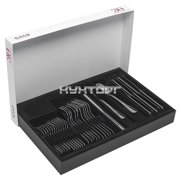 В комплект поставки входят 6 столовых ложек, 6 вилок, 6 столовых ножей, 6 чайных ложек и 6 десертных вилок.