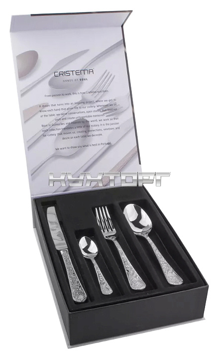 В комплект поставки входят 6 столовых ножей, 6 столовых вилок, 6 столовых и 6 чайных ложек.