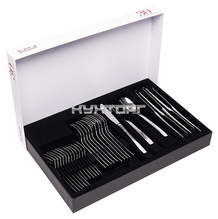 В комплект поставки входят 6 столовых ложек, 6 вилок, 6 столовых ножей, 6 чайных ложек и 6 десертных вилок.
