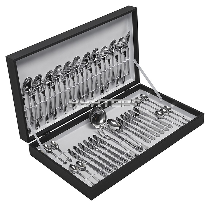 В комплект поставки входят 12 столовых ложек, 12 вилок, 12 столовых ножей, 12 ложек для кофе, 1 половник, 1 сервировочная вилка с 4 зубцами и сервировочная ложка.