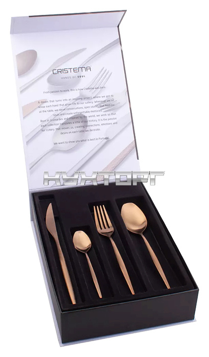 Набор столовых приборов CRISTEMA PEP-19300-24LECU серии Rabat используется на предприятиях общественного питания и торговли, а также в частных домах и квартирах для сервировки. Изделия выполнены из нержавеющей стали с керамическим PVD покрытием и матовой полировкой.