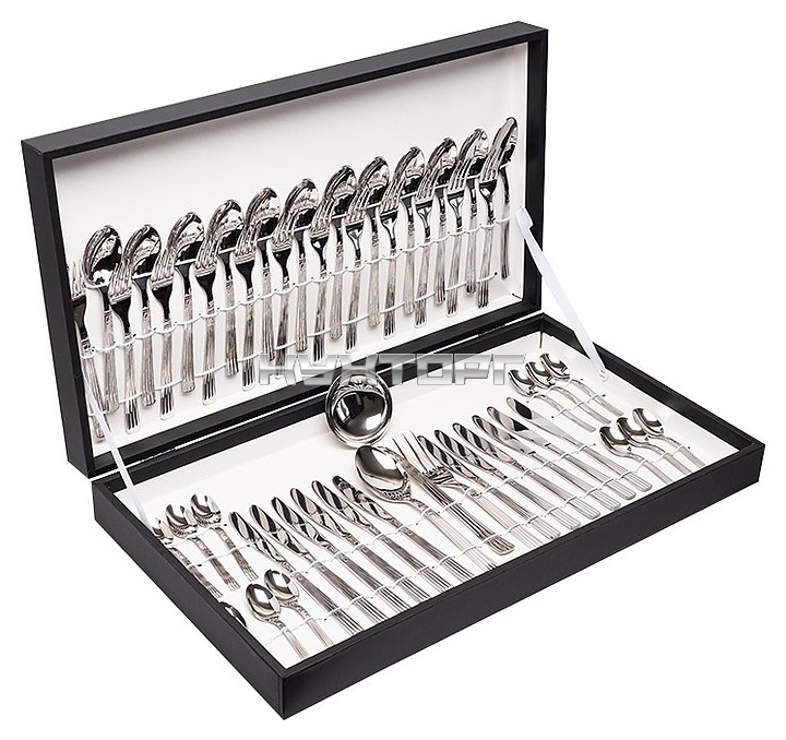В комплект поставки входят 12 столовых ложек, 12 вилок, 12 столовых ножей, 12 ложек для кофе, половник, сервировочная вилка с 4 зубцами и сервировочная ложка.