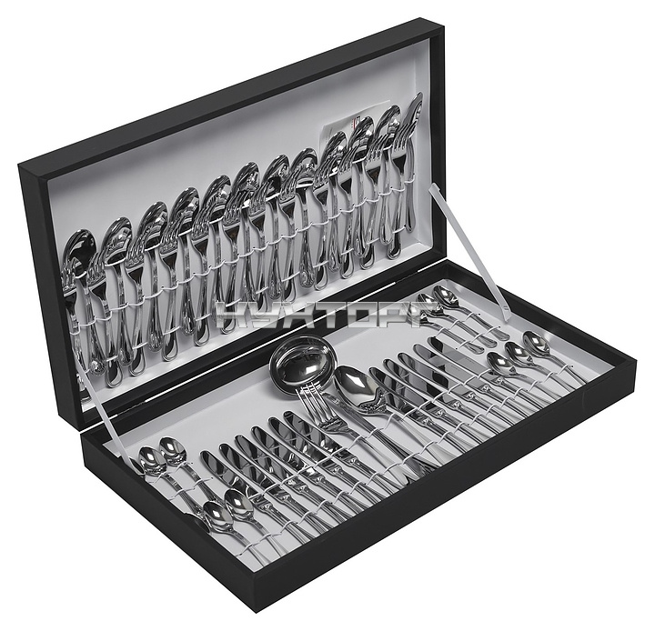В комплект поставки входят 12 столовых ложек, 12 вилок, 12 столовых ножей, 12 ложек для кофе, 1 половник, 1 сервировочная вилка с 4 зубцами и сервировочная ложка.