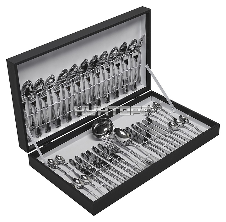 В комплект поставки входят 12 столовых ложек, 12 вилок, 12 столовых ножей, 12 ложек для кофе, 1 половник, 1 сервировочная вилка с 4 зубцами и сервировочная ложка.